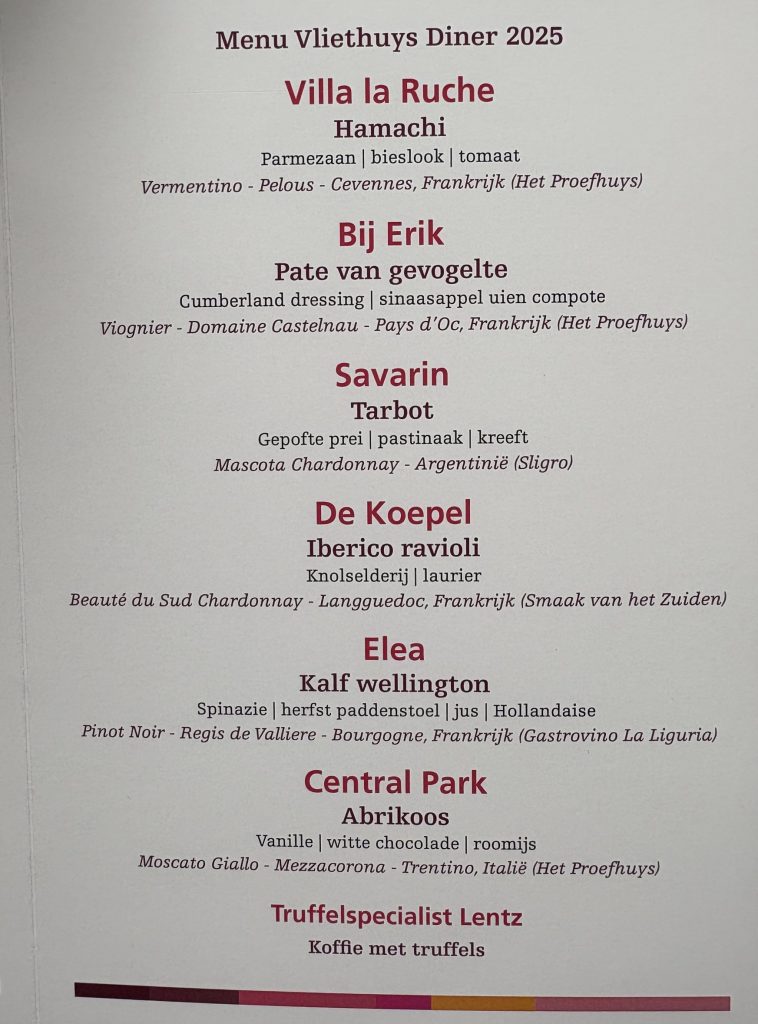 Het diner vond plaats in ROC Mondriaan in Den Haag. Daar worden jonge mensen opgeleid voor diverse functies in de horeca. Er is een restaurant, grote keukens en alle gelegenheid om een groots diner neer te zetten. Diverse topkoks uit de omgeving verzorgden allemaal een gerecht, er was wijn gesponsord door verschillende leveranciers, er was muziek en er waren enthousiaste studenten die met rode konen van de (in)spanning de gerechten uitserveerden. Het was allemaal overheerlijk en zeer copieus.