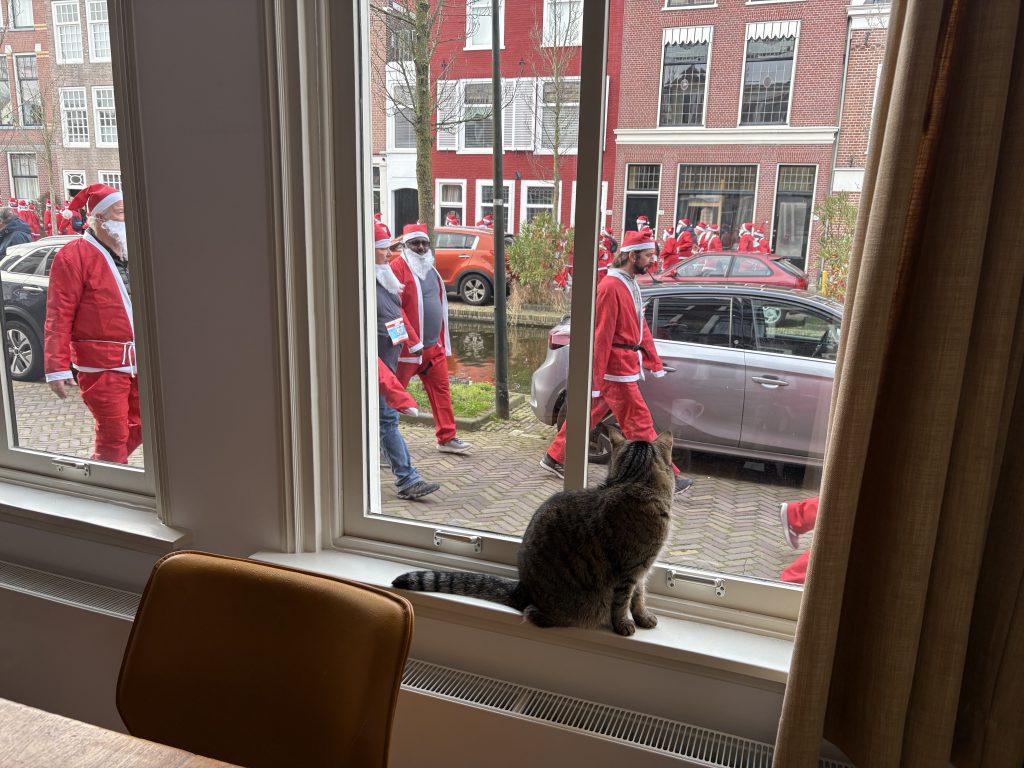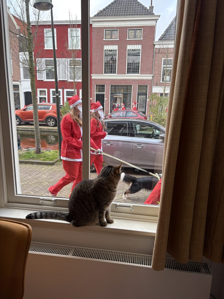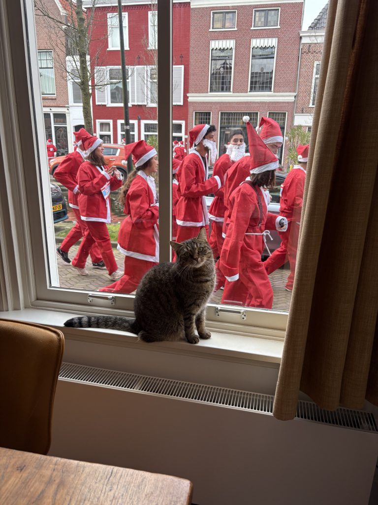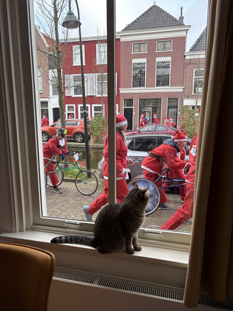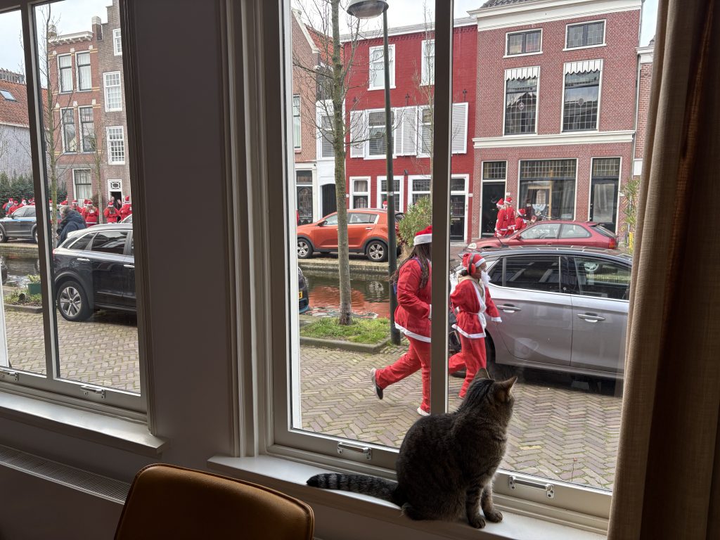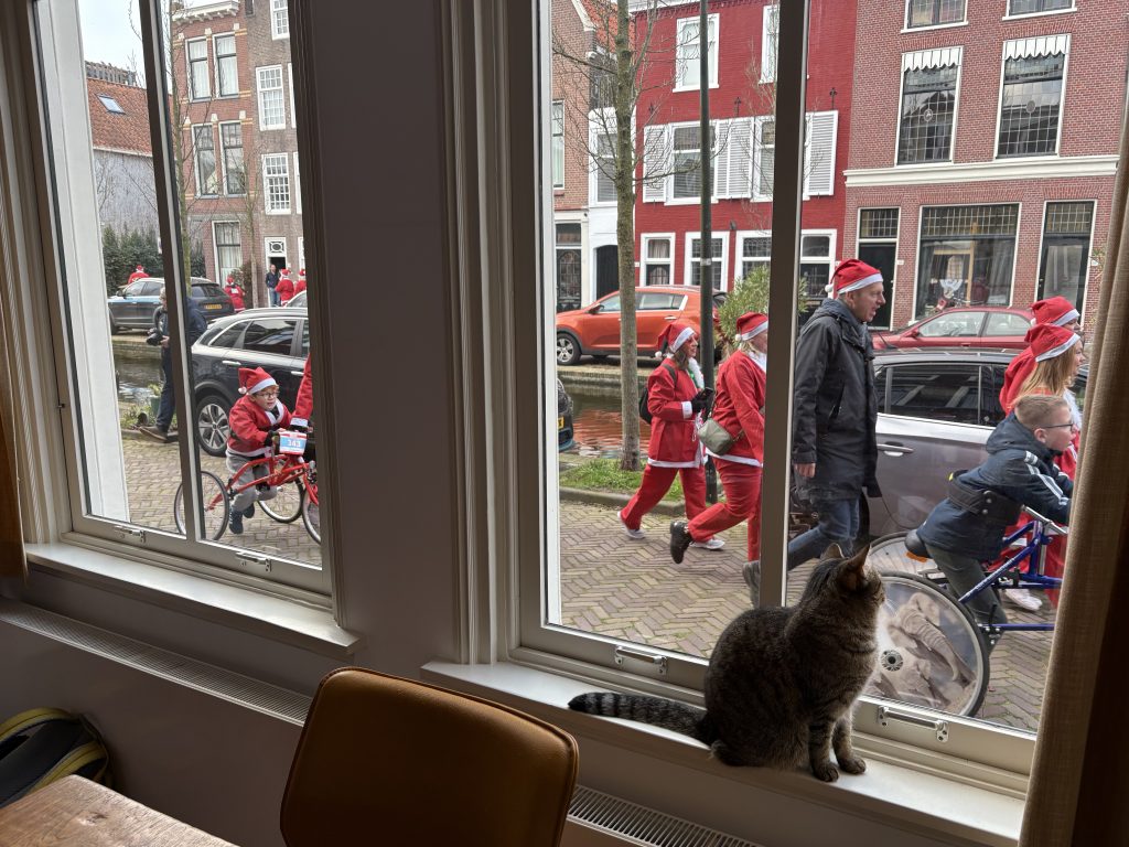 Wat is dat nu zo’n Santa Run? Ik citeer van hun website: “De Santa Run Delft is de jaarlijkse Kerst fun loop over 3 km door de versierde binnenstad van Delft. De loop wordt gehouden midden in het winkelgebied op de drukste koopzondag van december. Een imposante groep van 750 lopers in kerstmannenpak krioelt tussen de shoppers over de grachten en bruggen.” De route begint op de Burgwal en één van de eerste straten die de lopers inslaan is de onze. Op die manier komen ze nog allemaal vrij dicht op elkaar langs ons huis. Er wordt niet alleen gerend, je kunt de route ook wandelen of – als lopen niet tot de mogelijkheden behoort – op de driewieler meedoen. De sfeer is altijd gemoedelijk. Dat sloeg zelfs over op onze angsthaas Minette die het geheel met verbazing gadesloeg vanaf de vensterbank.