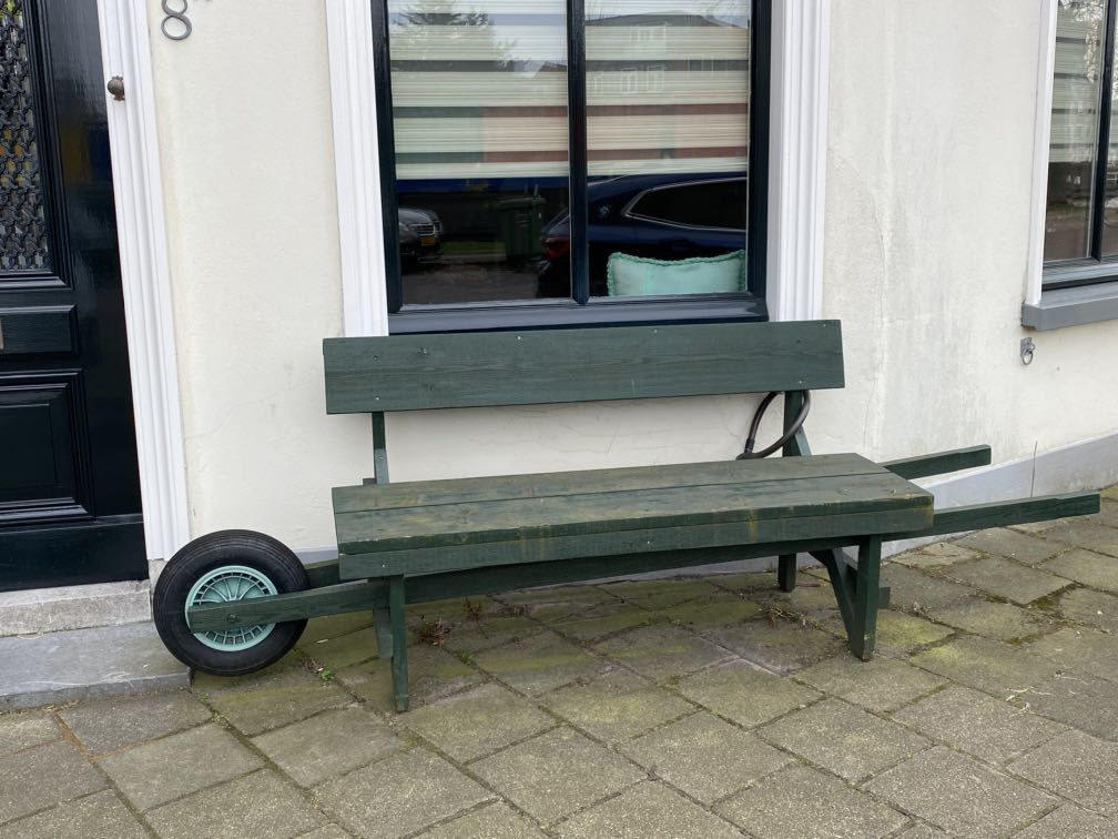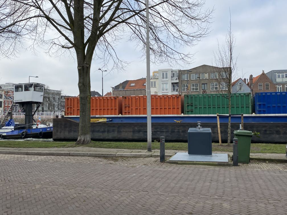 Bij een van de wandelingen langs de Schie werd ik gelukkig weer een beetje vrolijk. Ik zag achtereenvolgens zo’n mooi groot containerschip waarop staat dat het 16 vrachtwagens zijn, een grappig bankje en een truttig perkje. Saaiheid is in the eye of the beholder.