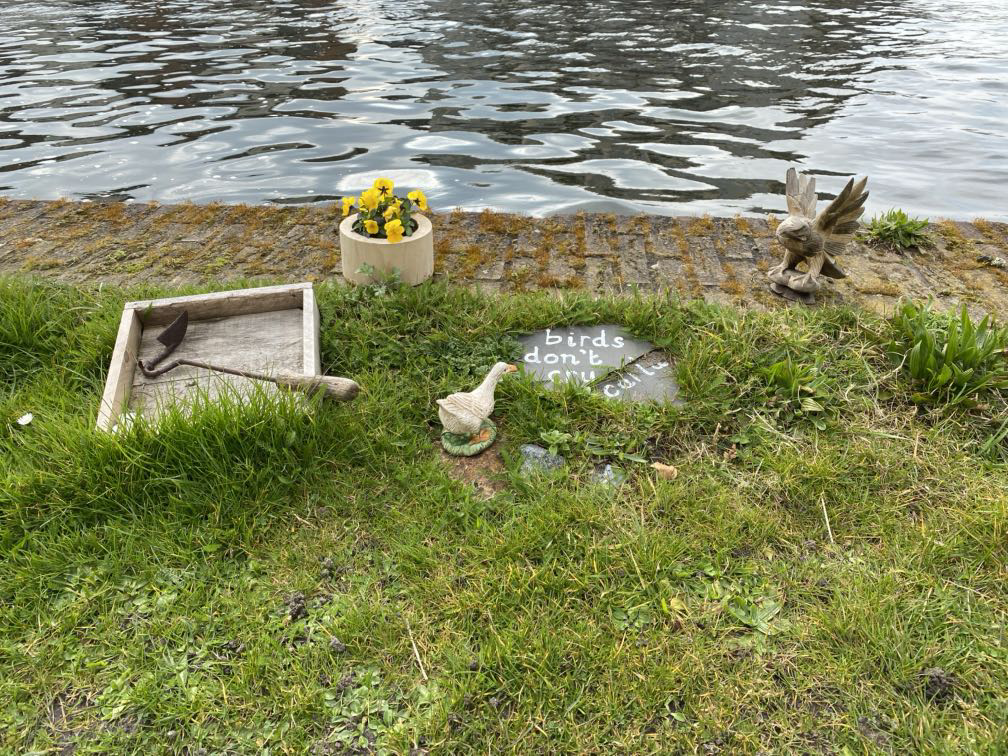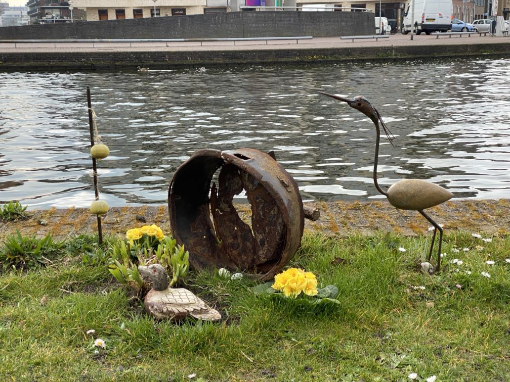 Maar ze doen ook rare dingen, zoals afschuwelijk lelijke vogelhuisjes ophangen in die parken. Ik heb er met tegenzin eentje op de foto gezet, maar er hingen er veel meer. Gelukkig viel er ook kunst te bewonderen. Een bootje vol mensen met de titel Spelevaren was extra grappig dankzij de twee kinderen die er vlak naast echt aan het spelevaren waren. Op de foto helaas bijna onzichtbaar.