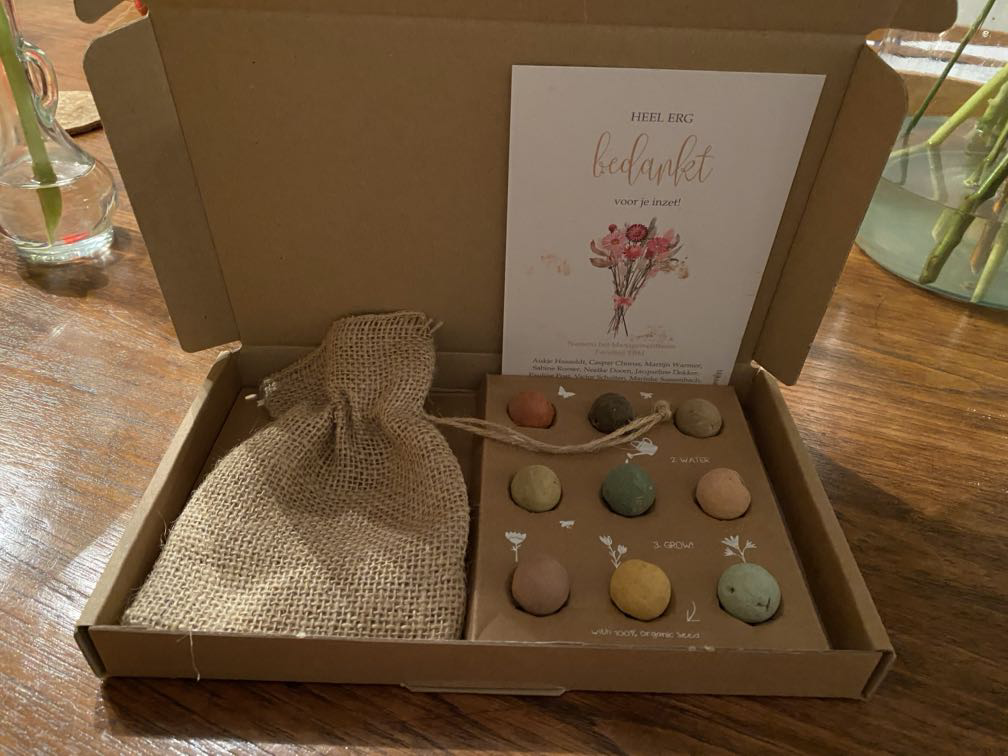 Gelukkig kwamen de cadeaus ook weer binnenstromen, deze keer voor Pieter: gekleurde bollen met zaden (?????) van de TU en taartjes van de studenten. Mijn loftrompetjes zijn weliswaar min of meer opgekomen, maar echt uitbundig zijn ze (nog) niet. Misschien gaan Pieters bloemetjes het beter doen. Daar lijkt mij weinig voor nodig.