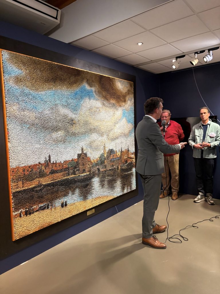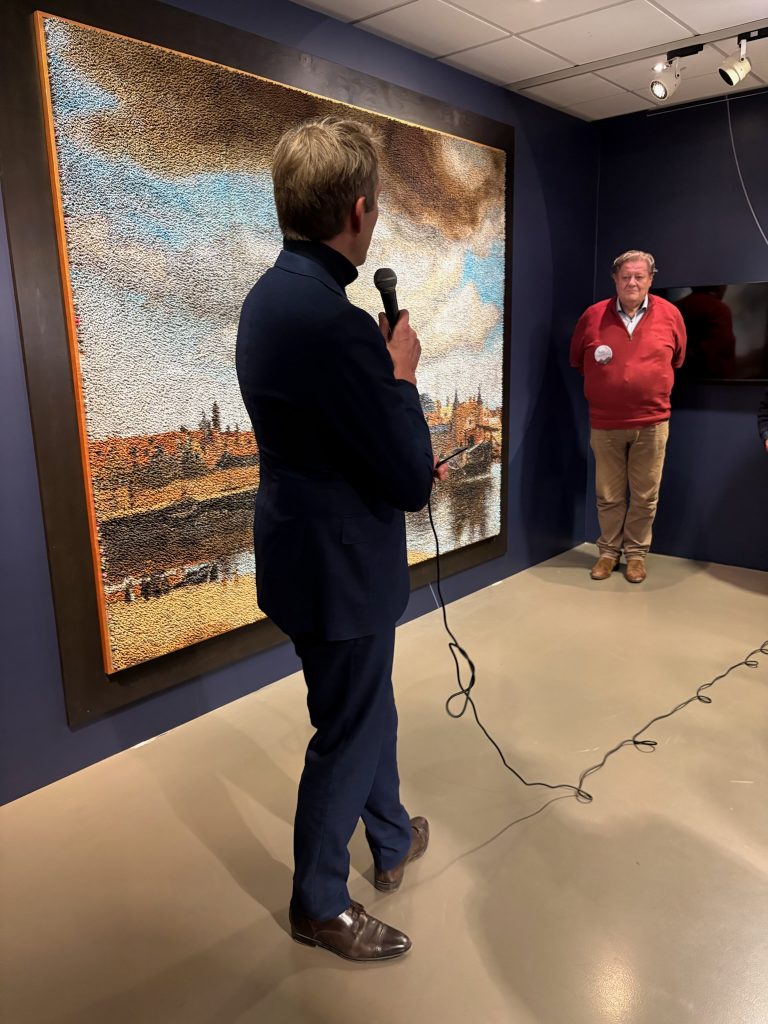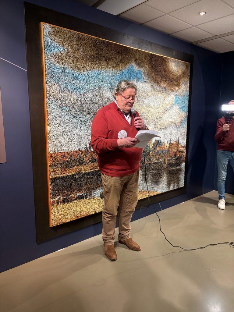 Er waren diverse praatjes in aanloop naar de plaatsing van het laatste poppetje. Achtereenvolgens Herman Weyers (directeur van het Vermeer Centrum), Frank van Vliet (wethouder Klimaat, Cultuur en Openbare ruimte), Pieter Roelofs van het Rijksmuseum Amsterdam en René Jacobs (de kunstenaar) zelf. Zij hielden allemaal inspirerende speeches over het belang van kunst voor de samenleving, hoe mooi Delft is (de man uit Amsterdam sprak lovend over ons stadje, het enige dat ontbreekt is een goede voetbalclub) en over het enthousiasme en de trots van alle ‘poppetjesplakkers’. Daarna werd het laatste poppetje geplakt op de plaats van de spits van de toren van de Nieuwe Kerk. We keken nog even naar een kort filmpje over het project en zwierven wat door het Vermeer Centrum.